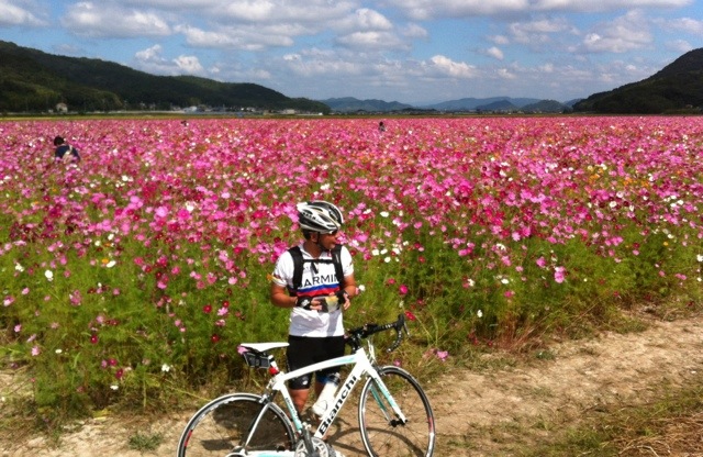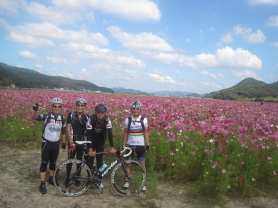 しばらくは花畑の前で休息、ライダー達、携帯でカメラに収め、本日のサイクリングの盛り上がり!!