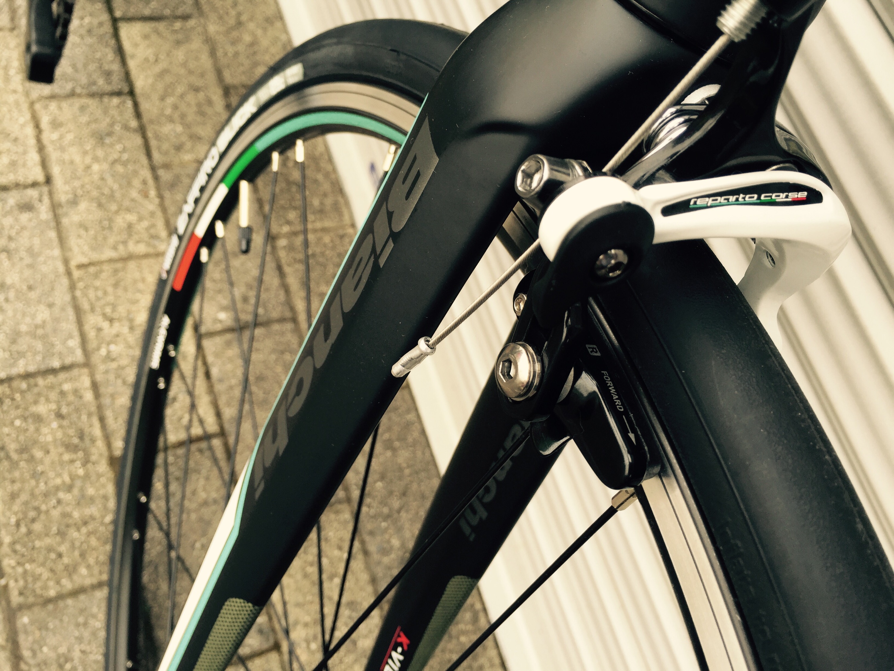 トップチューブ・ダウンチューブもオーバルパイプが使われ、しっかりとしたライディング安定感が臨めます。ホイール・タイヤは イタリアンデカールの貼られたreparto corse 専用のリム+vittoria 700-25c タイヤが採用されています。
