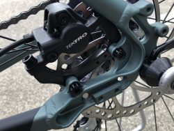 しっかりと止まる油圧ディスクブレーキとシマノ製の変速機、タイオガの最新タイヤ「FS100」29インチ2.10を装着。