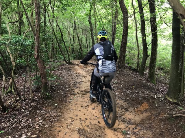 急な上り坂では木の根っこで滑って止まってしまうので登りのテクニックも必要です。