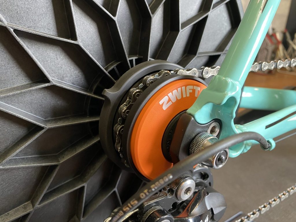 8~13速の様々なバイクに対応しており、チェーンラインを最適化したシングルコグで駆動するので不快なチェーンノイズがほとんど無い静寂なライドを実現。チェーンラインはコグ側で調整しなければいけないですが、一度調整すれば次からのセットアップは不要。ちなみにコグは1速しかないので変速動作はもちろんアウトです。変速動作ができない代わりにアプリと連動してトレーナーの負荷で疑似的に変速を再現します。