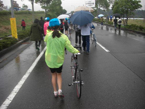 レース当日は、市民レースがあり、ジュニアレースの始まりが遅く、11:30スタートで、男子のあと15秒後にスタートとなりました。しかも今年は、ローリングスタートでなく、スタート位置から300m位後方からスタートとなりました。昨日の競技長ミーティングと違うぞ~と思いつつ、しとしと降る雨の中、グリットへ移動し、出番を待ちました。