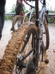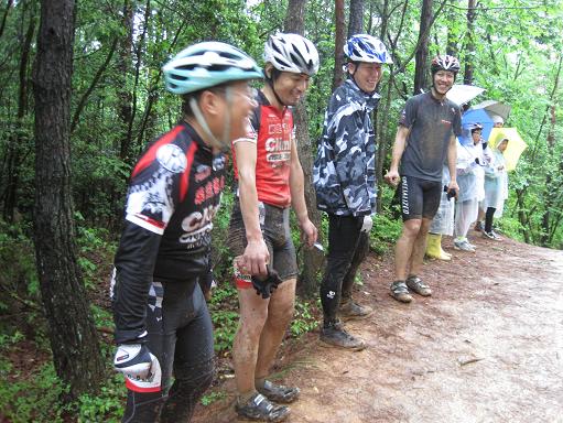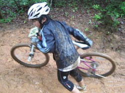 コースコンディションもドンドン悪化し、最終の上りでは、漕げず、運動靴を履いた足が、泥でスリップ、もぅ~シオポン・・・うぁ~お~あお~う~と言いながらMTBを持ち上げ一歩一歩、どろどろになった激坂を押し上げる~激しくXCコースで格闘するシオポンを「もうちょっとや~頑張れ~」と言いながら激写した!!