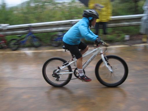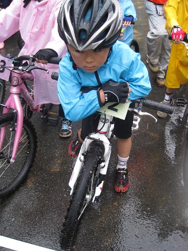 いよいよ、シオポン climbキッズライダーだ!吉備高原キッズ.ジュニアMTB中国大会 小学3・4年生クラス 1.7km 1周回を走る。雨が降り、結構コースが荒れてきてる。坂のぬかるんだ土にタイヤが喰いつかず、そのまま滑る~しかもシオポンのタイヤは、この雨を想定せず、MTB&ロード兼用タイヤだった。それでも、サイクルレースに集中するシオポンだった。