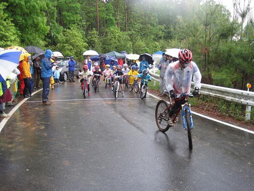 吉備高原MTB大会.キッズ、ジュニアMTB中国大会 no.2をお伝えします。ビギナーの後は、一般女子と小学生climbキッズライダーの出番です。けれども天候は、ますます崩れ、雨が上がる気配も・・・ヨウシャ無く雨が、ライダー達の足をさえぎる!!厳しいコンディションの中、健闘するclimbライダー!!
