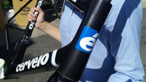 Climbスタッフが、持ちあげていますが、持ってみるとフレームの激・軽さにビックリ、手で触るとフレームの感触に質感が伝わって来ます。フレームデザインは、サーヴェロブラックにホワイトのストライプとガーミン・アーガイルラインで色分けされています。サーヴェロファンには、ホンマ、そそるcervelo R5VWD LTD 限定車でございます。