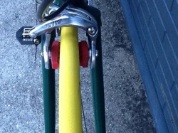 ブレーキシューはMagic One/キャリパーブレーキシュー・レッド、タイヤはVELOFLEX/コルサ・ブラック(イエロー)、チューブはパナレーサー/R’AIR、ロックリングはポッププロダクツ/ゴールドへとチェンジ!