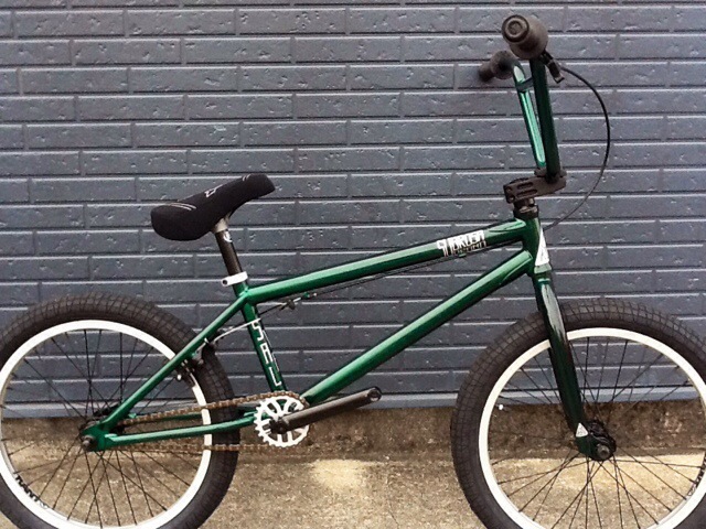 写真ではチョ〜ット分かりづらいかもしれないですが、ハンドル・フォーク・フレーム全てが、渋ーいメタリックグリーンで塗装され光に照らすとめちゃくちゃカッコ良い!