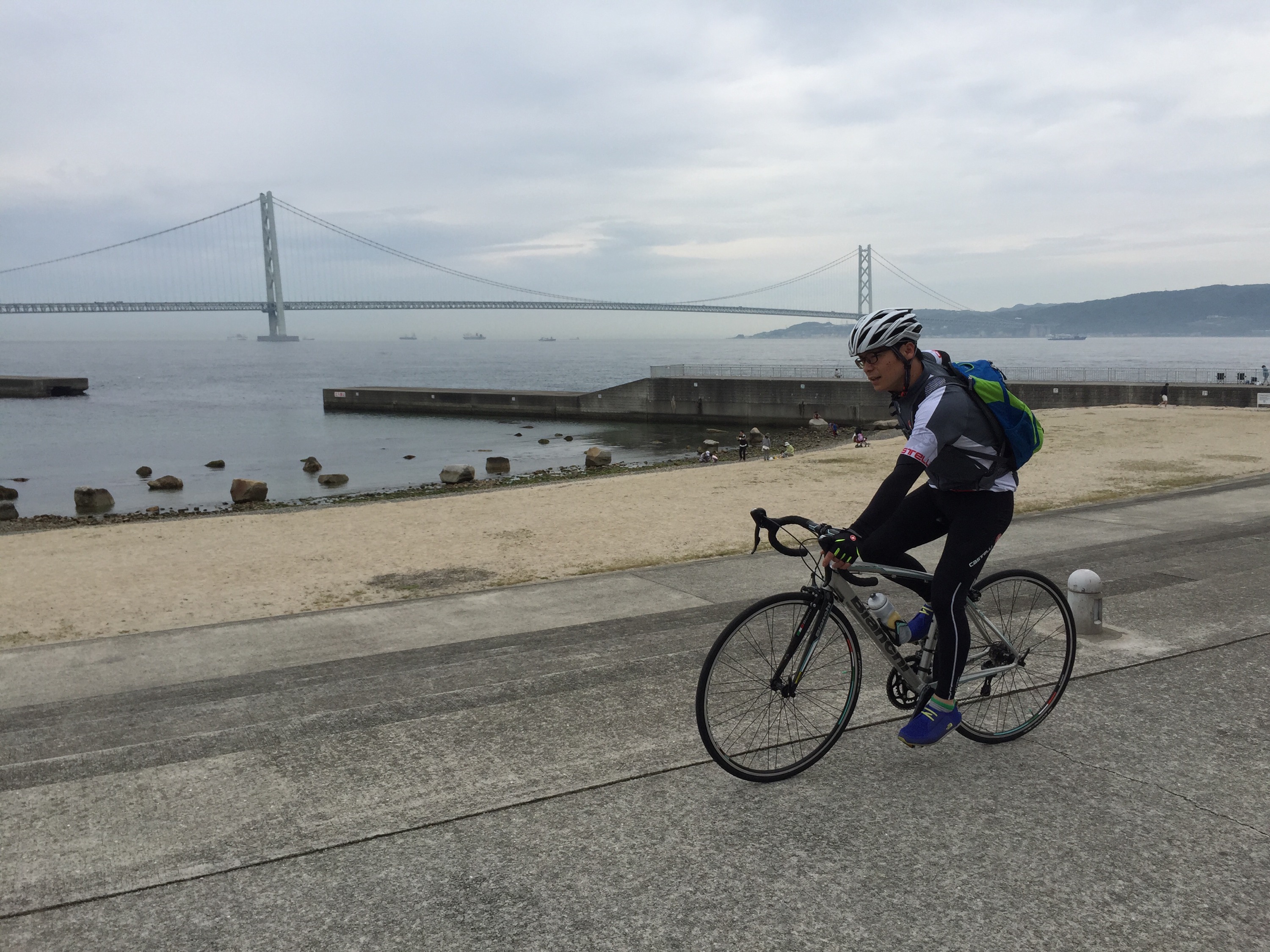 自転車仲間で海岸線沿いのサイクリング道路を走り、明石焼きを食し、大蔵海岸・舞子公園・スターバックス神戸西舞子店から明石海峡大橋を眺める企画