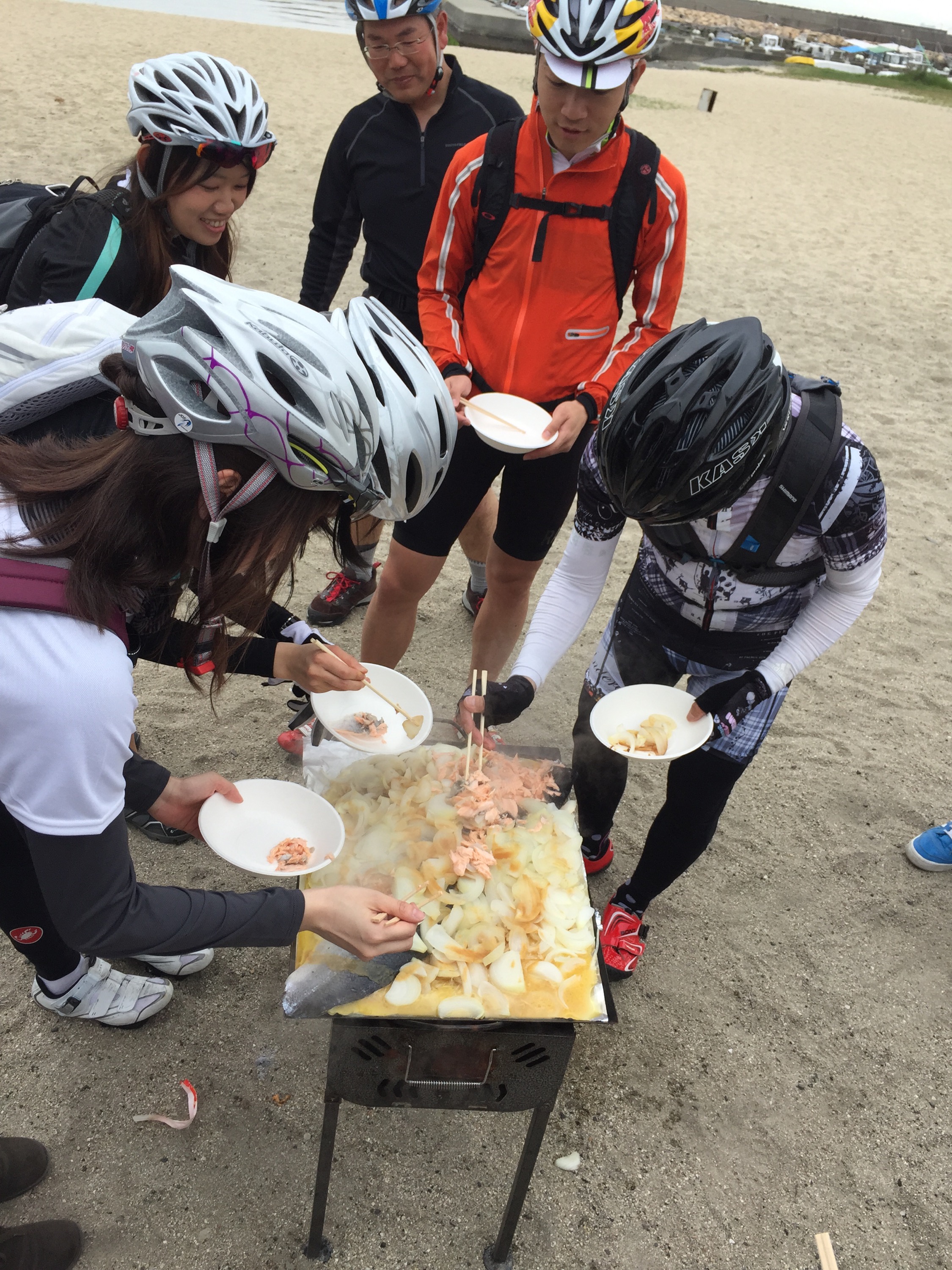 江井島でバーべQをしていた方が ライダーに話しかけ、食べて帰る・・・と・・・ソコは遠慮が無いClimbライダー達、淡路の新タマとサケのチャンチャン焼きやで~~と言われ(ヨダレ)、パクリ・パクリと頂きました。