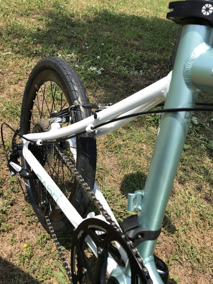 ダッシュシリーズの最大の特徴であるロックジョーシステムを採用した高剛性フレーム。一見、折りたたみに見えないスマートな仕上がりになっていますが、付属の工具で簡単に折りたためます。ヒンジ部の剛性の高さがもたらす快適な乗り心地は折りたたみ自転車とは思えない程です!また、初夏を感じさせるような色合いのフロストグリーン、この時期にピッタリではないでしょうか!
