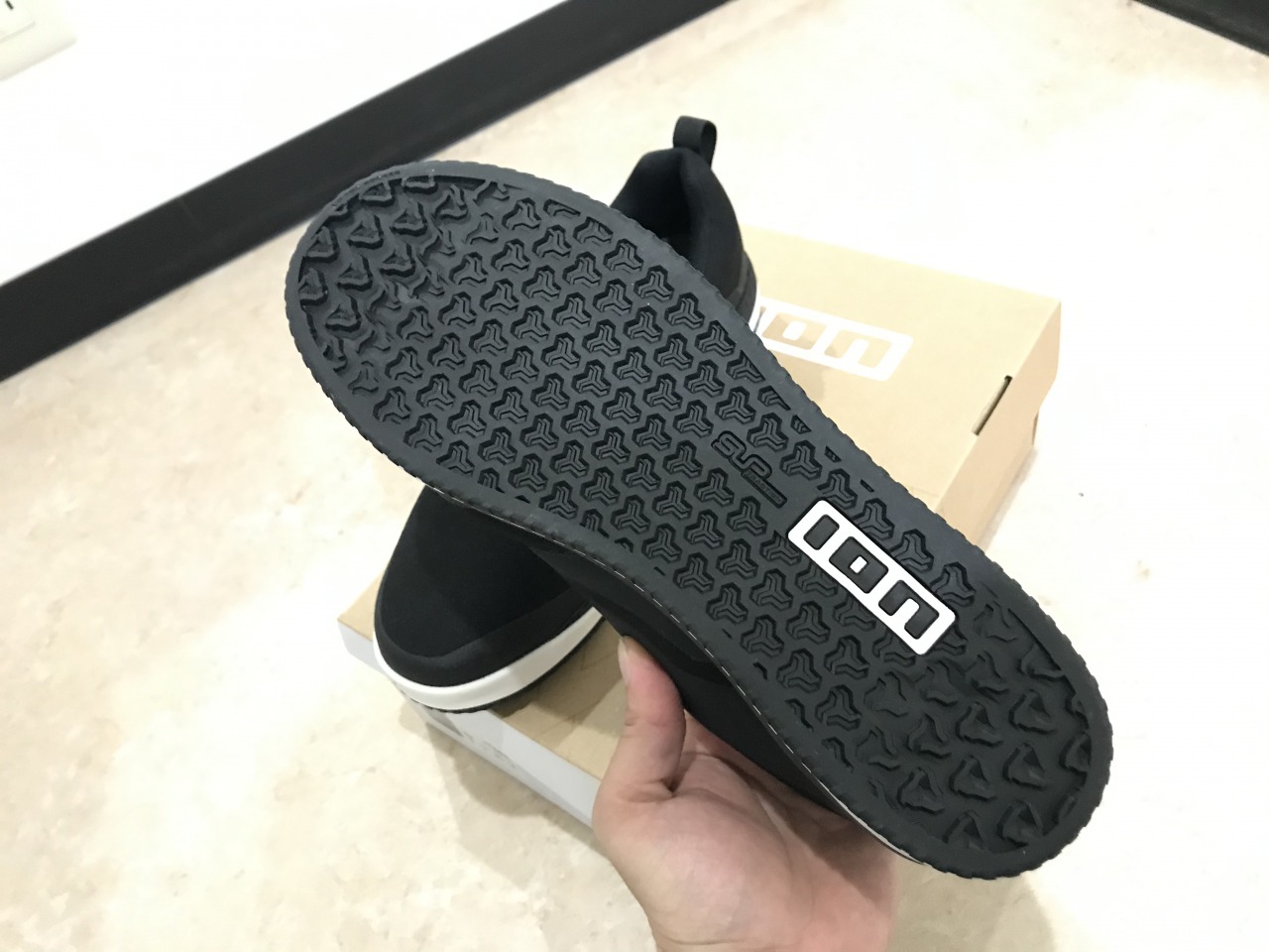 マウンテンバイク フラットペダル用のシューズも重要!ソール部がしっかりと硬く、つま先のガードがあり、かかと部も硬くなっています。
