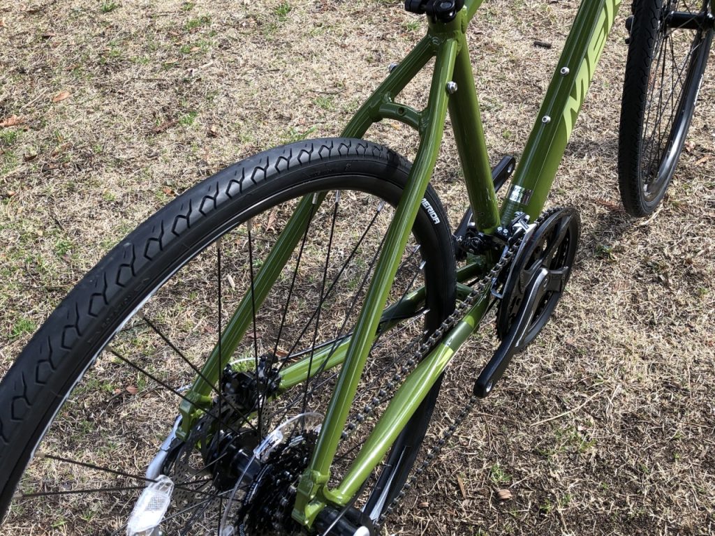 タイヤは安定と軽量性の良いサイズ700×32c、ブレーキはメンテ性にすぐれるワイヤー引きのディスクブレーキ。