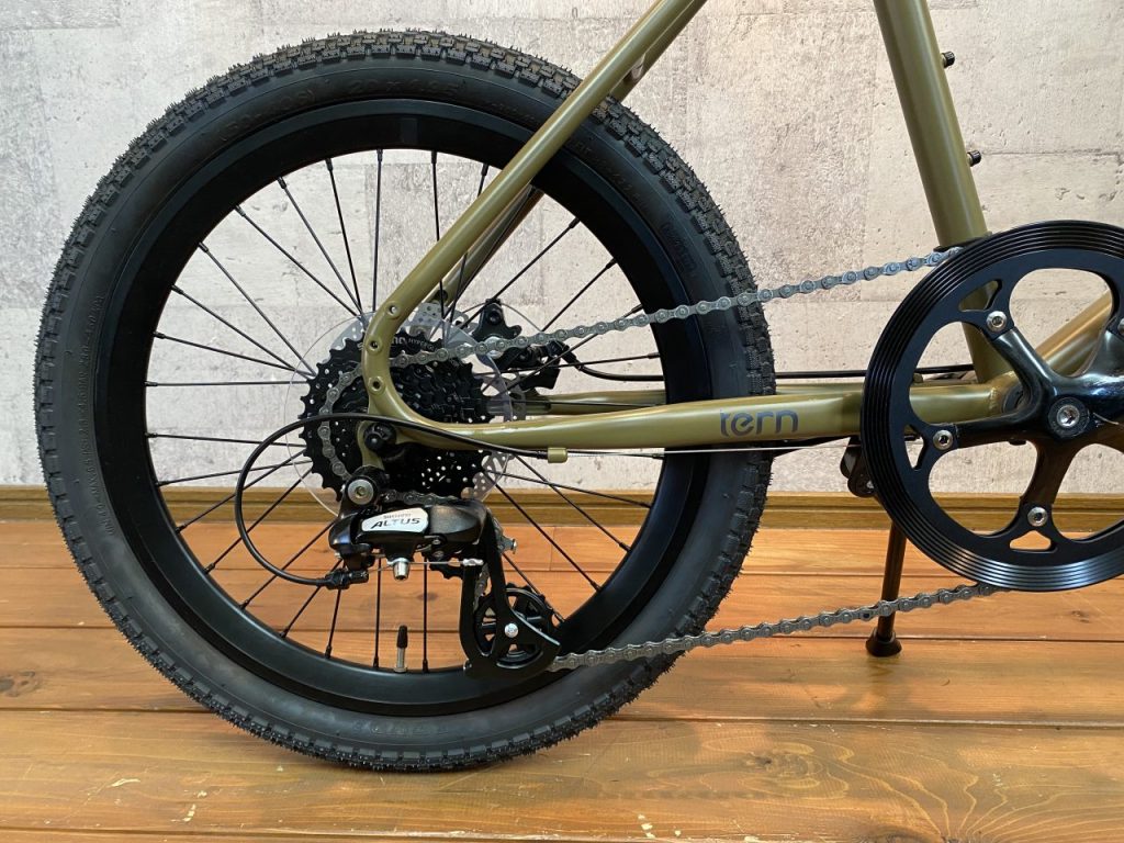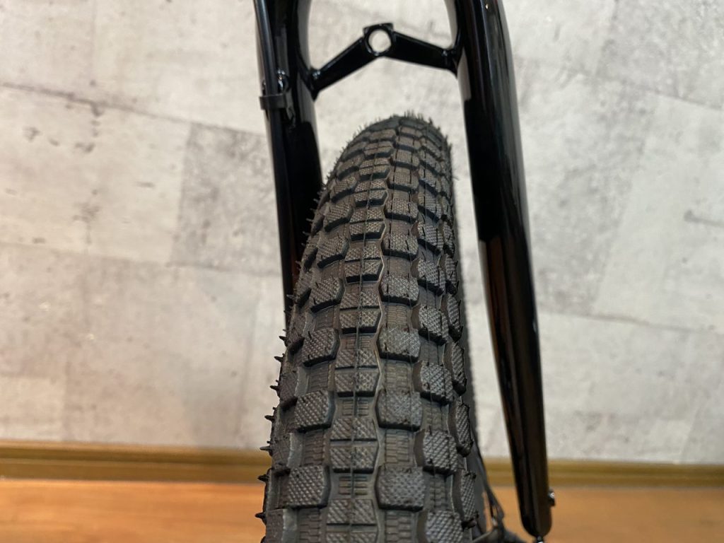 20×1.95のブロックタイヤが標準装備。このタイヤであればはちょっとしたオフロードでも走れるぐらいに安定感があるので、街乗りには安心して乗っていただけます。
